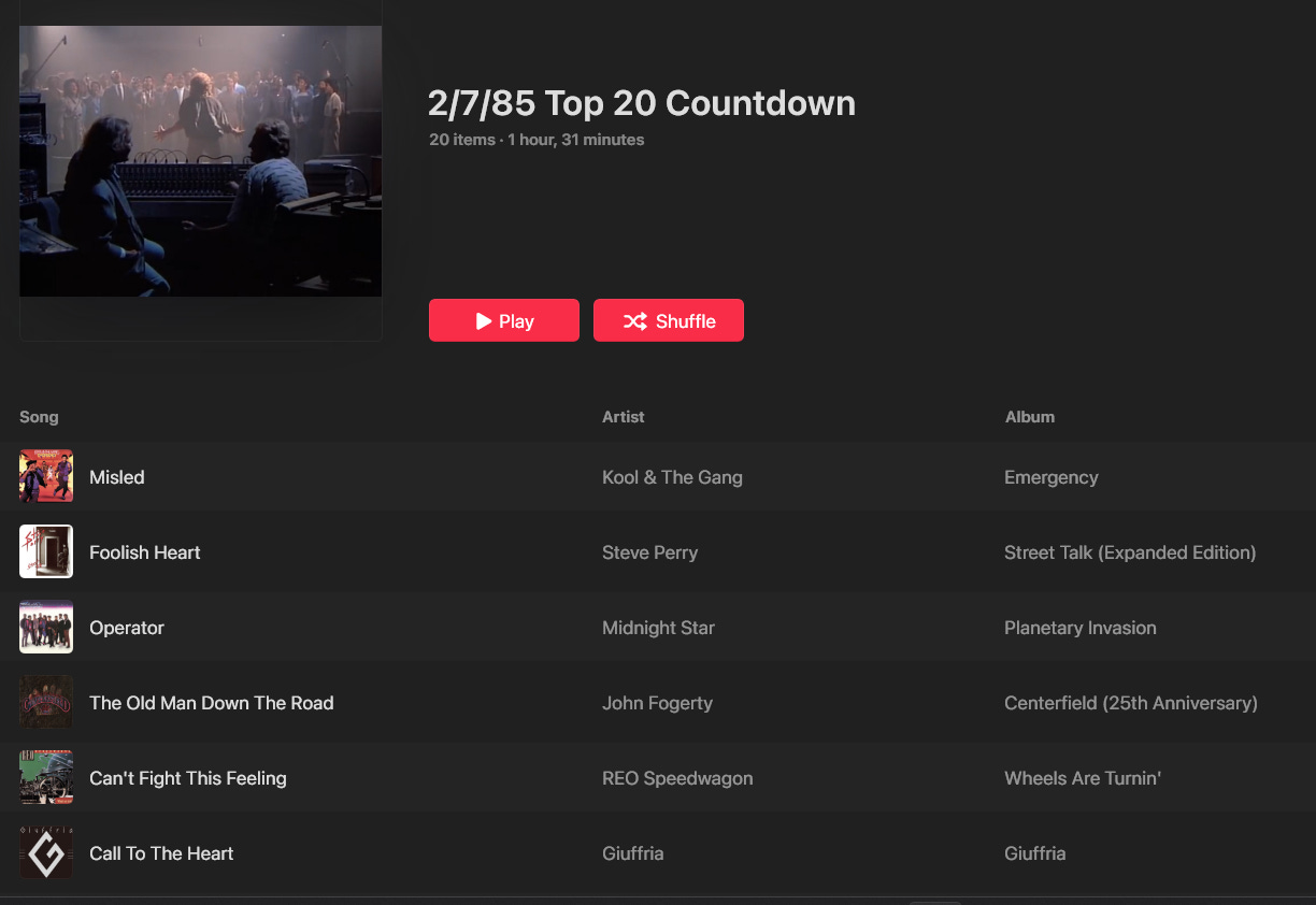 Every Saturday I make a playlist of the Top 20 Countdown from this week in 1985.