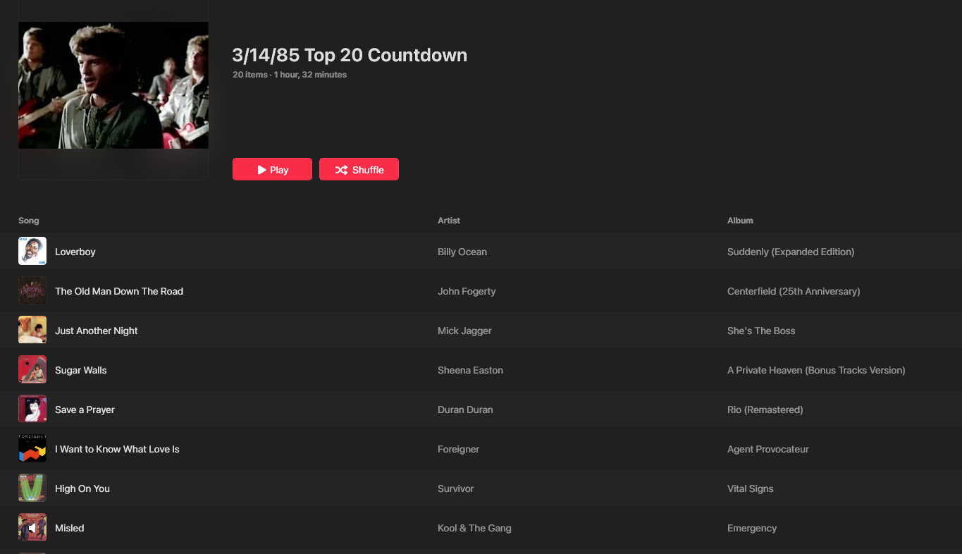 Every Saturday I make a playlist of the Top 20 Countdown from this week in 1985.